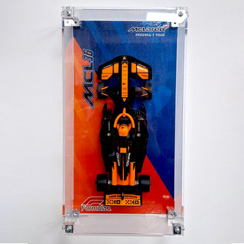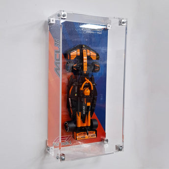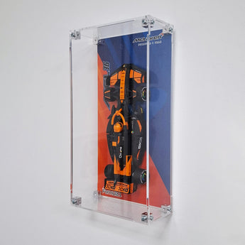 Vetro Exhibitors, pone a la venta Exhibidor armable de acrílico transparente de 3 mm con fondos tematicos para LEGO SPEED CHAMPIONS F1.