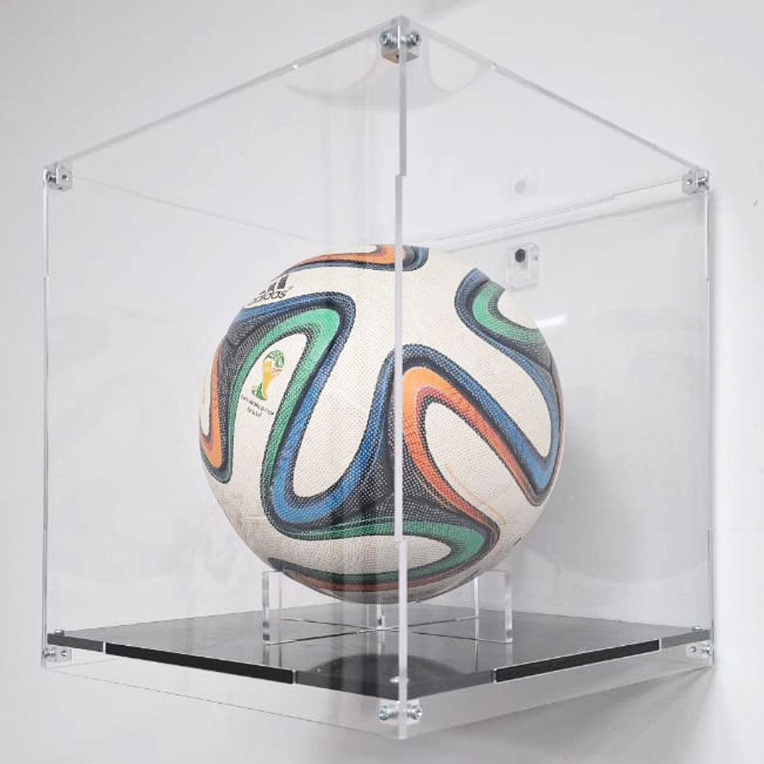 Vetro Exhibitors, pone a la venta Exhibidor armable para pàred de acrílico transparente de 3 mm con base plana de acrílico negro de 6 mm, ideal para exhibir balones de futbol tamaño 1:1 (profesionales)