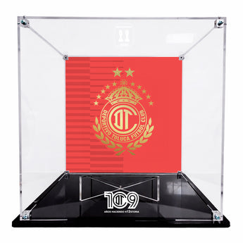 Con este exhibidor armable para escritorio de acrílico transparente de 3 mm con base plana de acrílico negro de 6 mm, ideal para exhibir tu balón del Deportivo Toluca Fútbol Club.